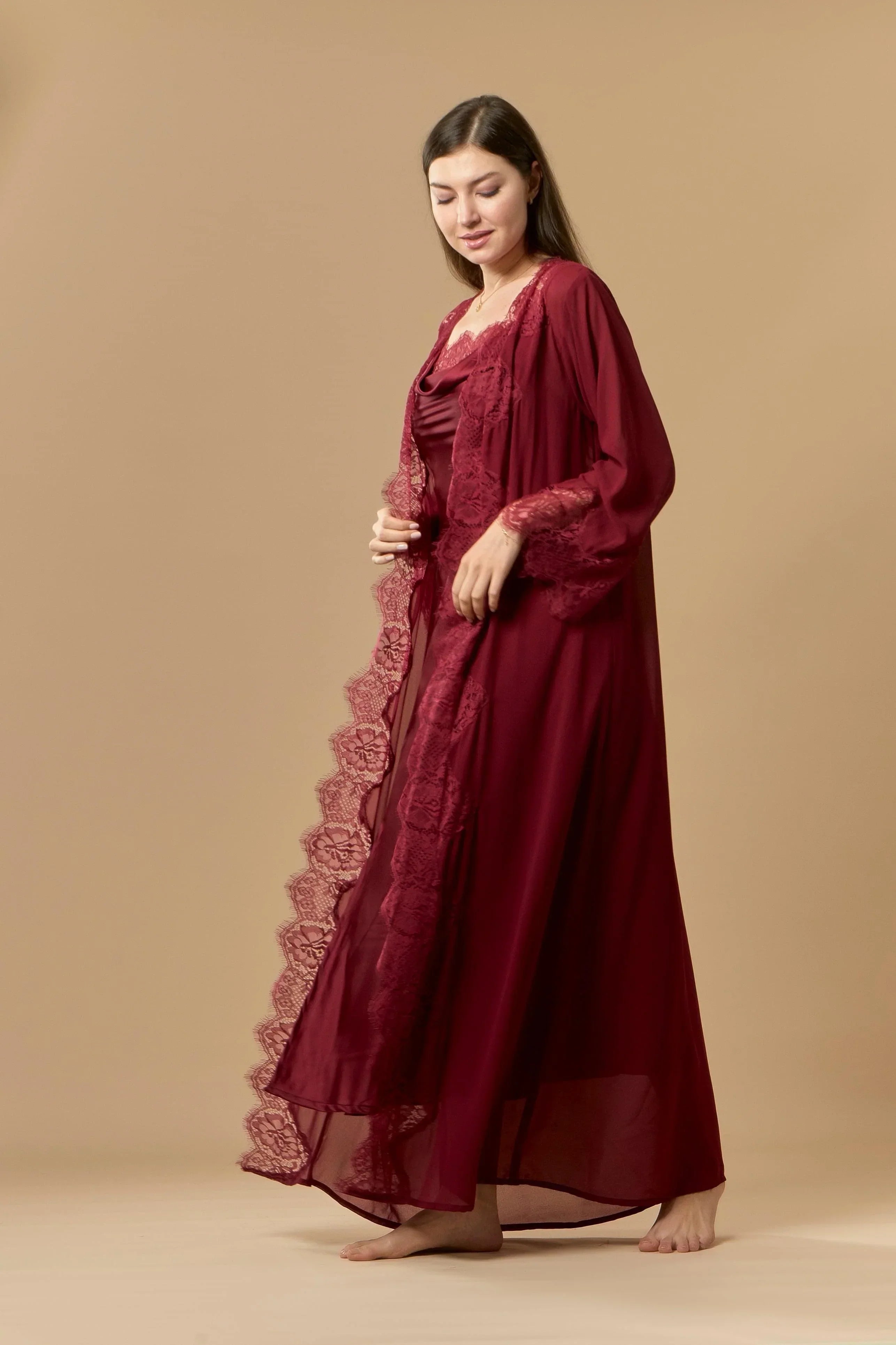 This Gorgeous Nightwear Set Features a Romantic And Soft Chiffon Robe Adorned With Chatilly Lace While The Long Silky Satin Nightdress Comes With a Halter Neckline Also Adorned With Chantilly Lace And A Sexy Touch Of Buttons On The Sideline.