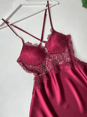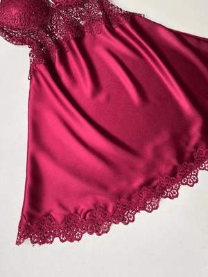 Maroon Guipure Detailed 6-Piece Satin Nightgown Dressing Gown Set