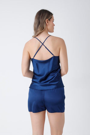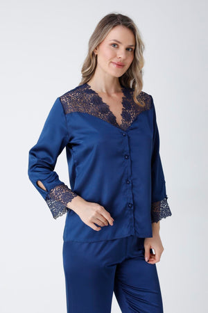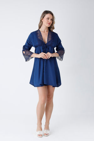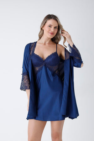 Navy Blue Guipure Detailed 6-Piece Satin Nightgown Dressing Gown Set