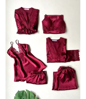 Turkish Detailed 6-Piece Satin Nightgown Dressing Gown Set Maroon